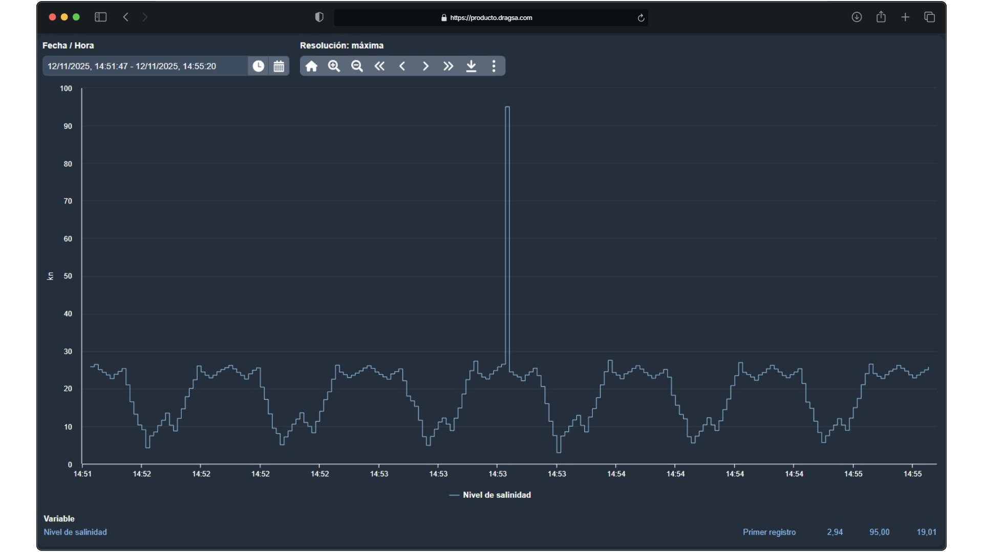 Unfiica los datos esenciales de la planta —salinidad, pH, temperatura y niveles de oxígeno— para reflejar en tiempo real la condición de cada activo Un cambio de tendencia en la salinidad, provoca que el sistema lance una alerta inmediata que muestra el incidente con la gráfica asociada y genera un informe automatizado.