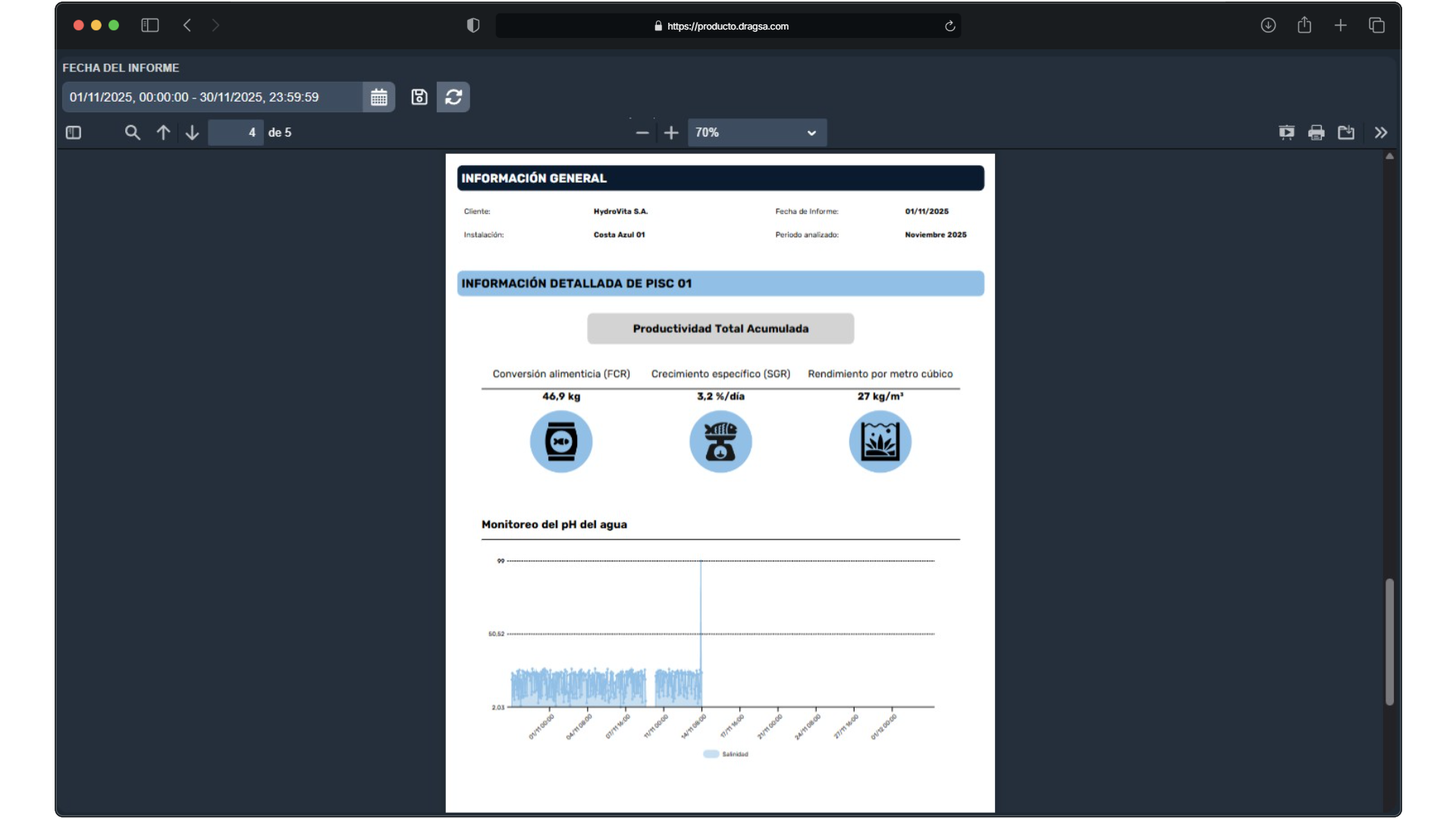 Genera un informe automáticamente al activarse cualquier alarma o cambio de tendencia fuera de los límites previstos. En el informe es completamente personalizable y con datos dinámicos. Incluye históricos de alarmas, gráficas detalladas con cambios de tendencia y las mediciones necesarias para evaluar y documentar las incidencias o crear reportes periódicos. Los técnicos pueden acceder a este informe, optimizando la gestión de la planta de acuicultura de forma rápida y efectiva.